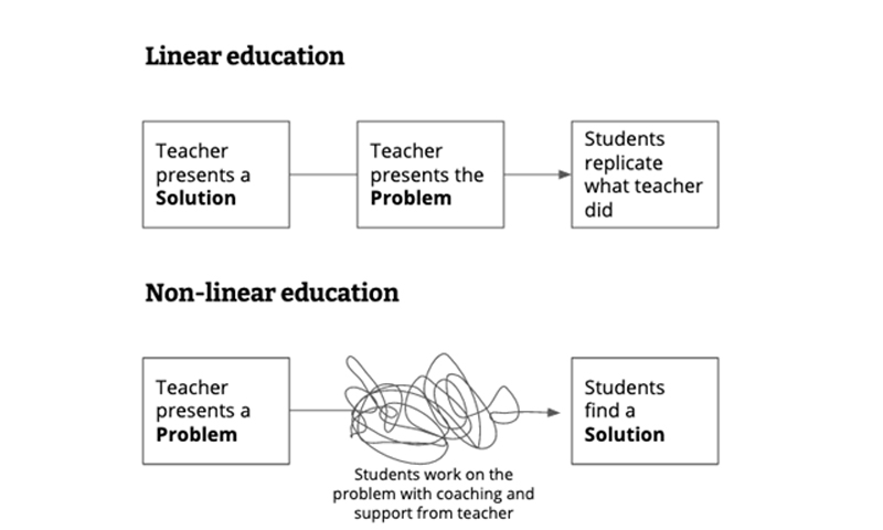 One of the most notorious ways traditional education tries to make learning easy is by teaching students a solution before presenting the problem. In a traditional and linear education setting, students are trained to mechanically apply a set of pre-packaged information to solve a predefined problem. Teachers present a solution to a problem and then ask students to replicate what they just learned. But, as everyone knows, that’s not how real life works. Outside of the classroom, the problem always comes first, and it forces us to figure out a solution with little previous knowledge. It’s a much more difficult process, and one that is inherently non-linear.
